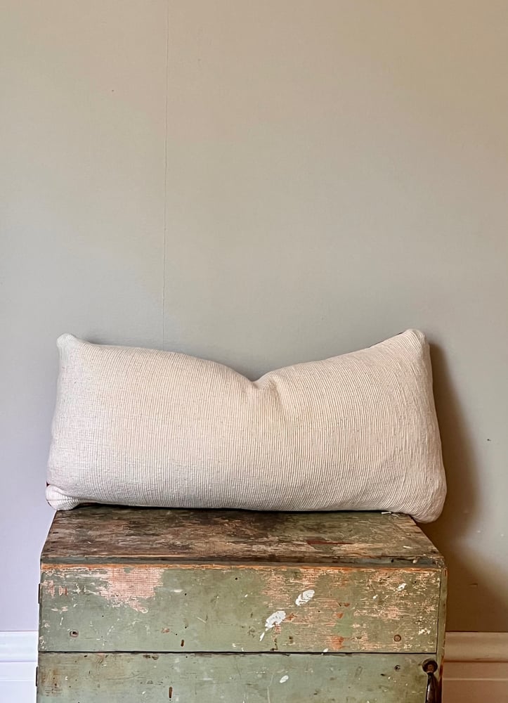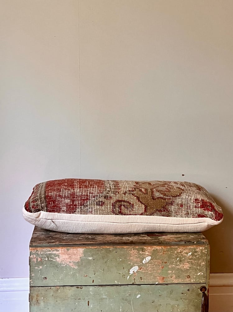 12”x24” pillow made with vintage Turkish wool rug and backed with ribbed cotton. Pillow insert included with an invisible zipper.